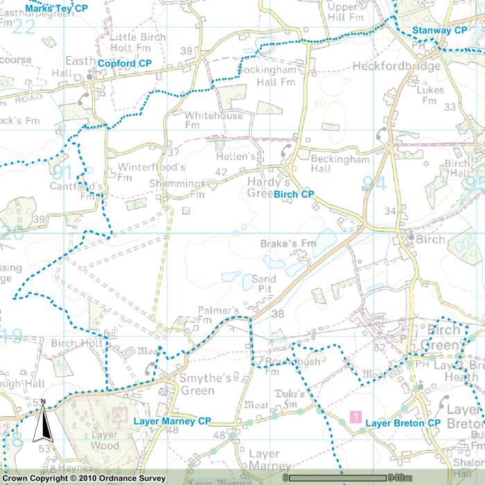 The boundary of Birch Civil Parish follows a somewhat irregular course. From Heckfordbridge on the northern edge of the parish the boundary runs east, following the course of the Roman River. East of Hill Farm it turns south and continues south, passing just to the east of Garlands Farm, to a point between Bumblebee Farm and Rows Farm. Here it turns north to the north-east corner of Layer Breton Heath. It continues north for a short distance before curving round, first west, then south, towards the Hare and Hounds public house. The boundary then heads west towards Stamps & Crows before turning north and west to Roundbush Farm.
